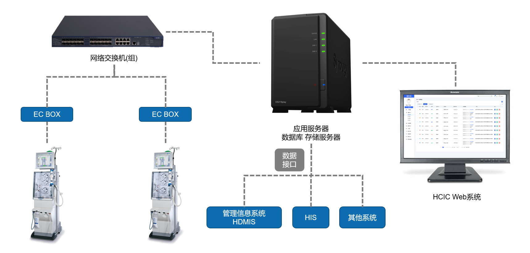 血液透析室设备较多,治疗过程往往长达3-4小时, 我们通过EC BOX读取透析机的治疗数据和报警信息,器械厂家也可以通过数据分析设备运行情况,做出故障判断和处理, 同时也能够为科室主任提供额外的治疗数据的分析增值服务,帮助厂家拓展盈利模式。